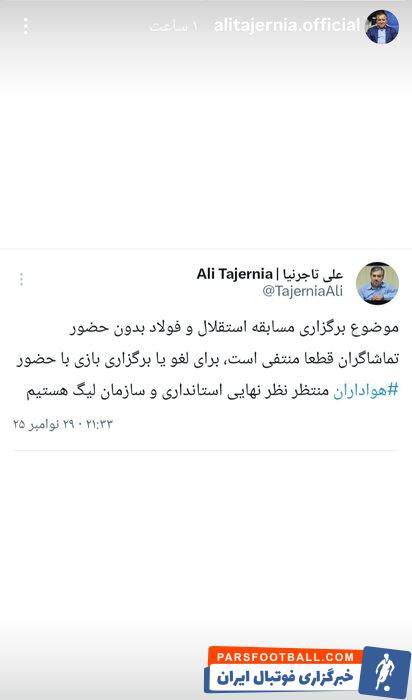 تیم فوتبال استقلال فردا (یکشنبه) در هفته یازدهم رقابتهای لیگ برتر فوتبال ایران به مصاف فولاد خوزستان خواهد رفت. در ساعات اخیر، شایعاتی مبنی بر برگزاری این مسابقه بدون حضور هواداران منتشر شد. این شایعات زمانی جدیتر شد که سامانه بلیتفروشی، این بازی را بهصورت ناگهانی از صفحه فروش حذف کرد. علی تاجرنیا سرپرست مدیرعاملی و رئیس هیأتمدیره باشگاه استقلال با انتشار توییتی، نسبت به این اخبار واکنش نشان داد.