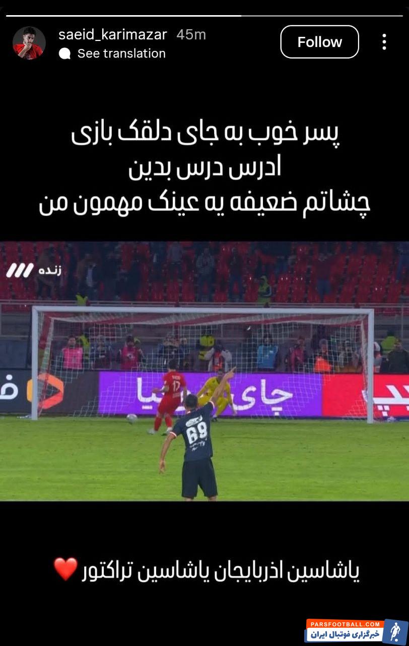 پیام اینستاگرامی سعید کریم آذر بازیکن تراکتور خطاب به کاظمیان ستاره پرسپولیس : جای دلقک بازی آدرس درست بده ؛ چشمات هم ضعیغه عینک مهمون من