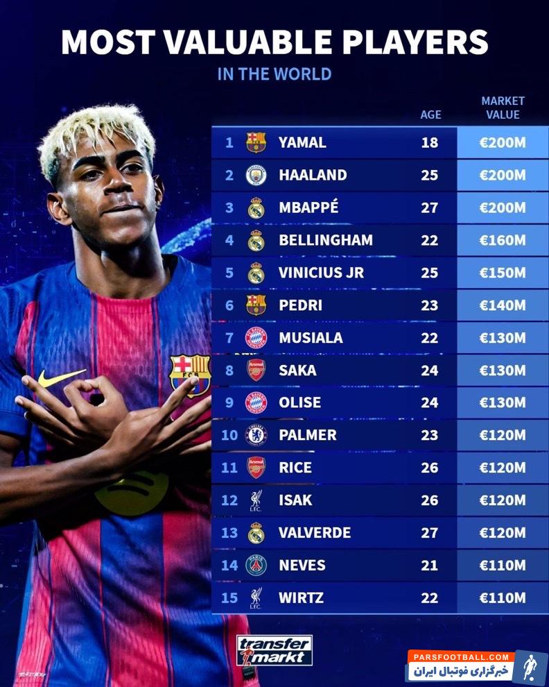 صدرنشینی مشترک یامال، هالند و امباپه در صدر فهرست ارزشمندترین بازیکنان جهان در سال ۲۰۲۵ جالب توجه است.