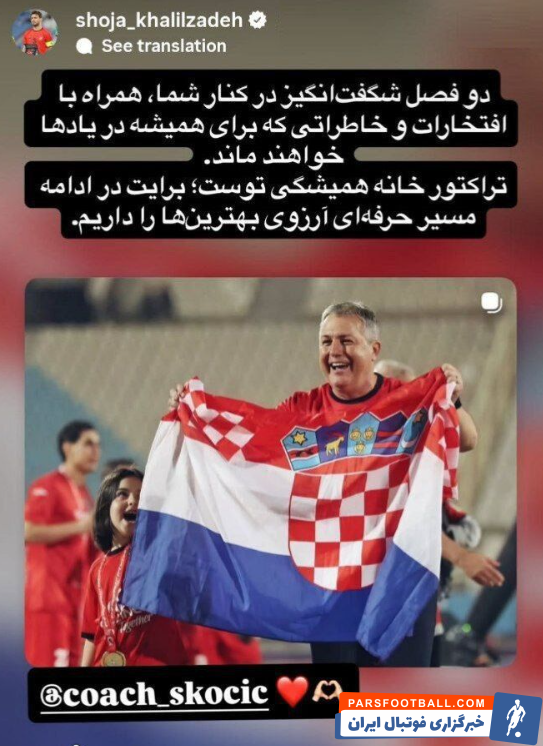 واکنش اینستاگرامی شجاع خلیل زاده به جدایی دراگان اسکوچیچ از تراکتور : دو فصل شگفت انگیز در کنار شما همراه با افتخارات و خاطراتی که برای همیشه در یادها خواهند ماند