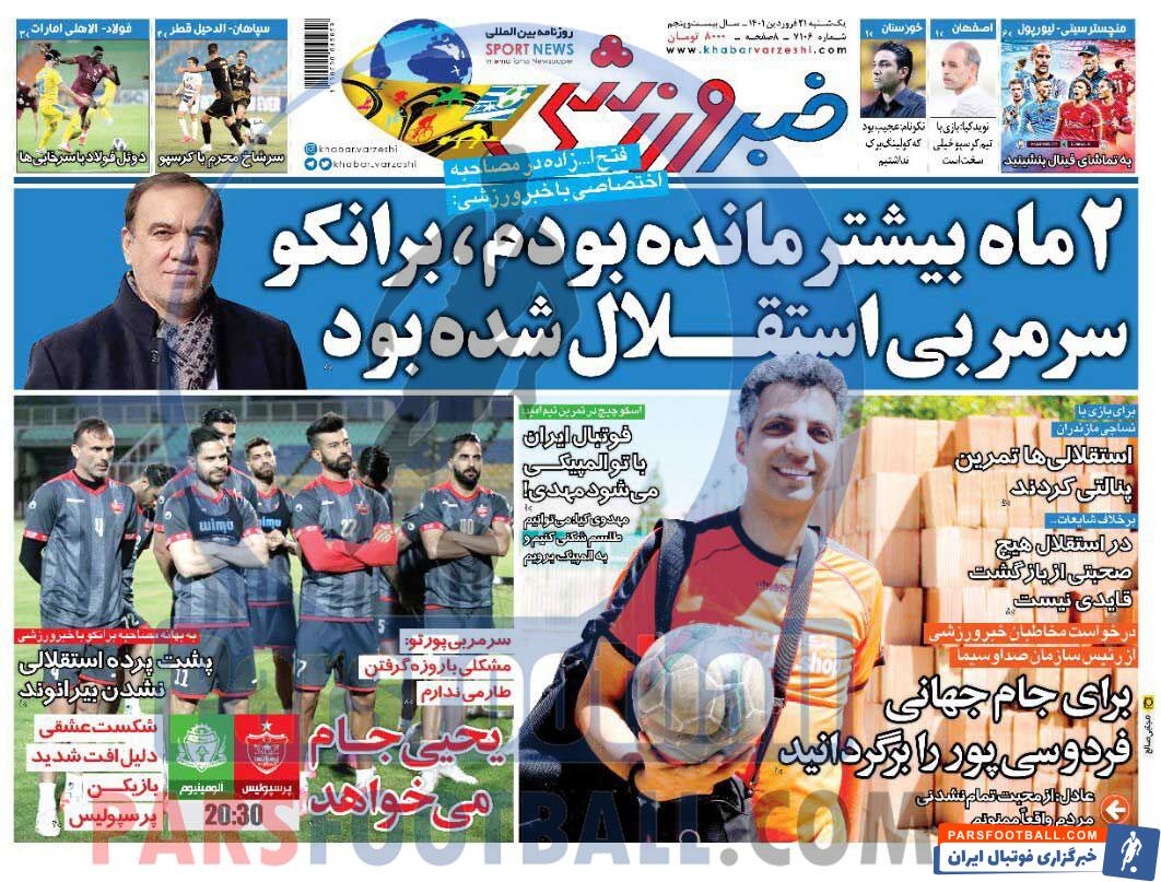 عناوین روزنامه خبر ورزشی یکشنبه ۲۱ فروردین ماه به شرح زیر است :