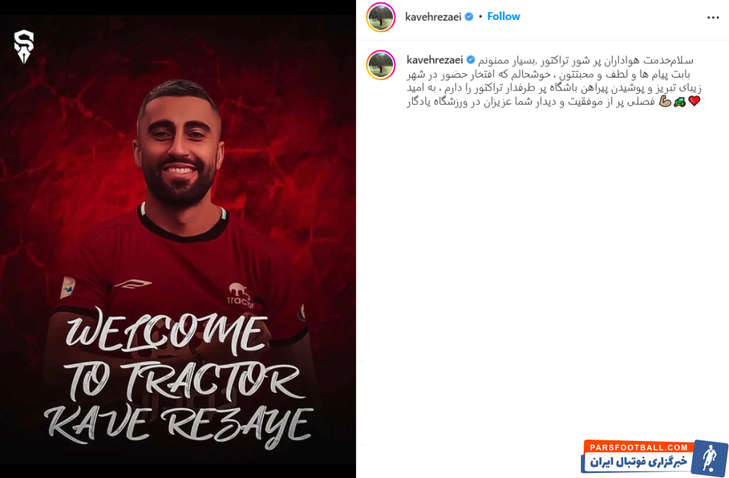 کاوه رضایی که به تازگی به تراکتور پیوسته است، پستی در اینستاگرامش منتشر کرد: