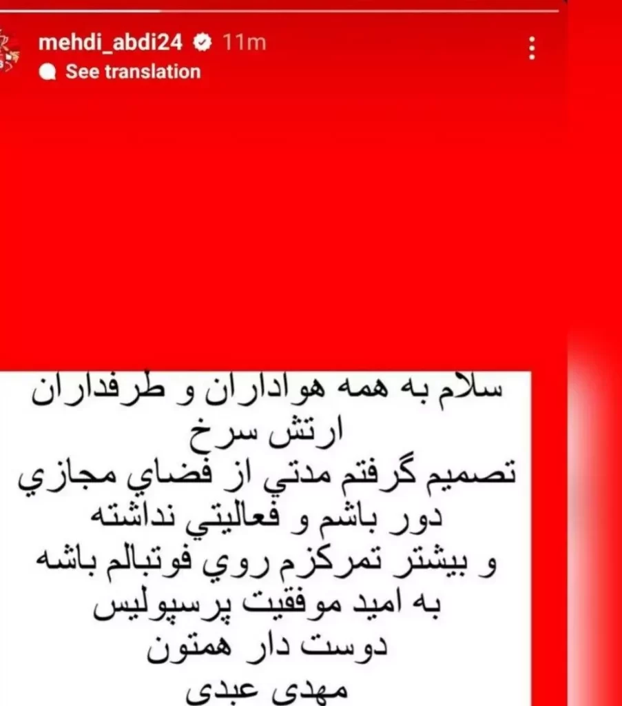 مهدی عبدی مهاجم پرسپولیس با انتشار یک پیام در اینستاگرام از فضای مجازی خداحافظی کرد.