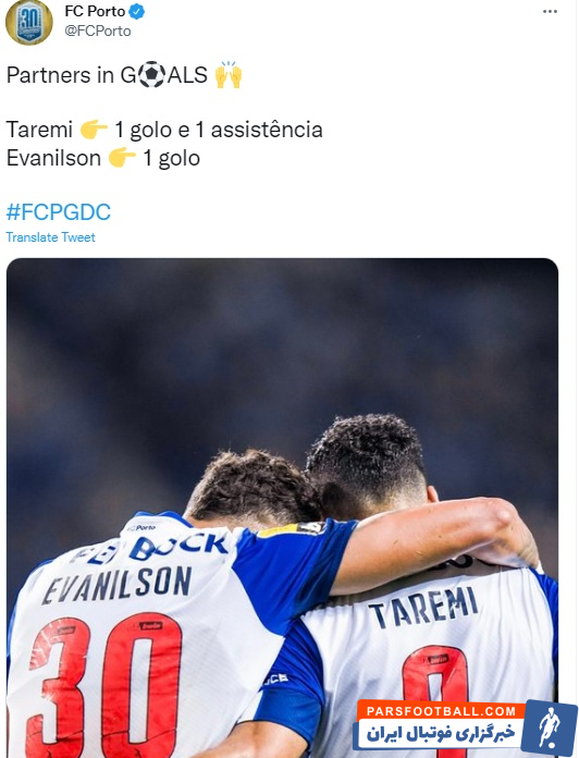 توئیتر رسمی باشگاه پورتو امروز با انتشار تصویر زوج خط حمله تیم یعنی مهدی طارمی و اوانیلسون از این دو بازیکنش تقدیر و تشکر کرد. باشگاه پورتو با پیام تشکر از گلزنان و گل سازان نوشت: