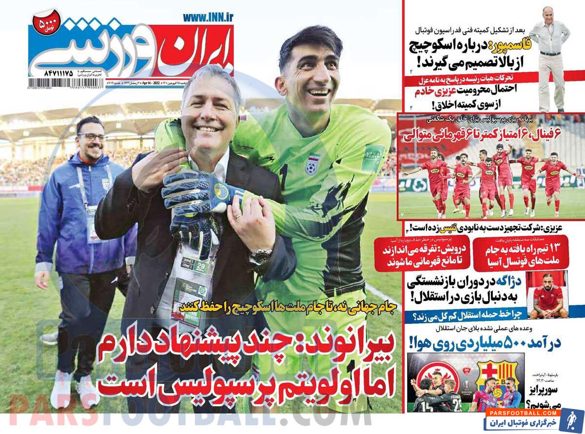 عناوین روزنامه ایران ورزشی پنجشنبه ۲۵ فروردین ماه به شرح زیر است :