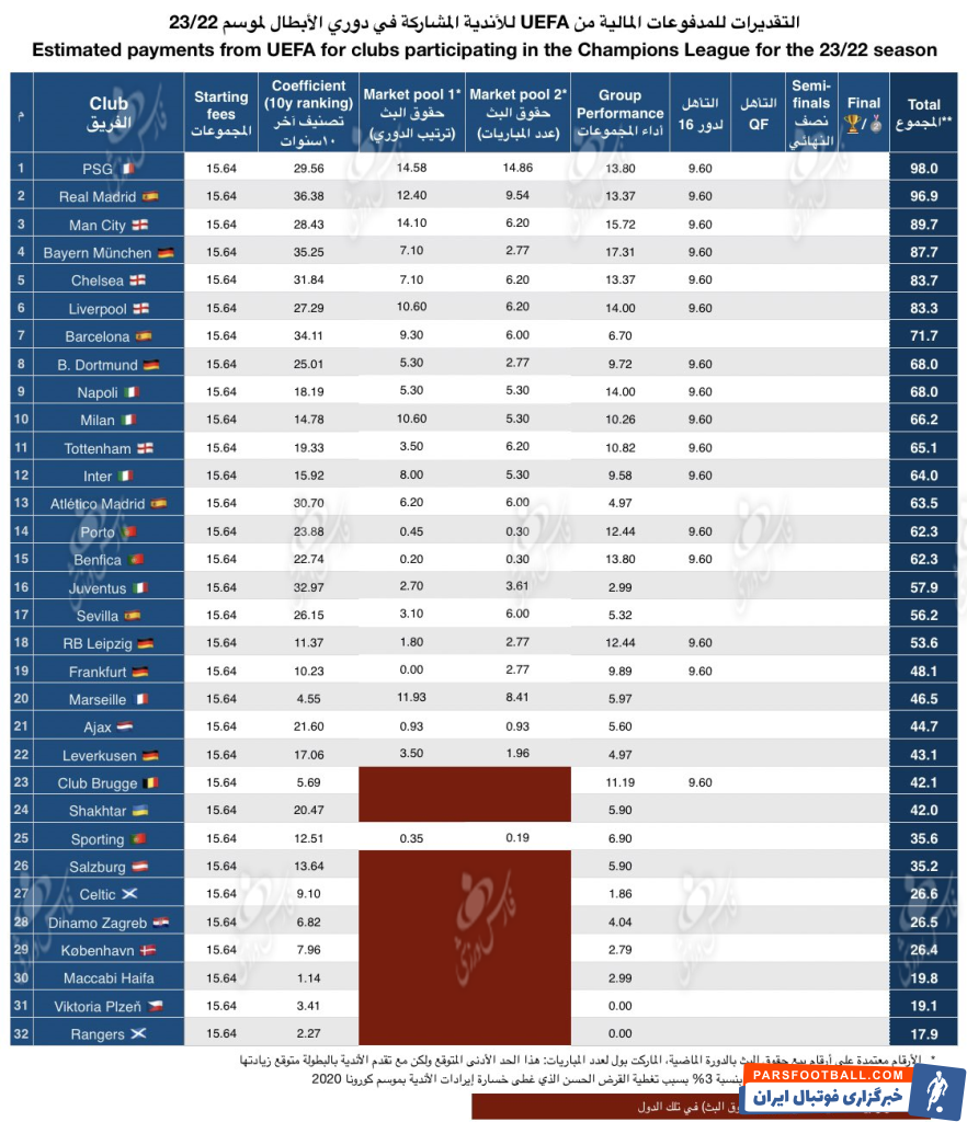 باشگاه پاری سن ژرمن با درآمد ۹۸ میلیون یورو پردرآمدترین باشگاه اروپا تا مرحله گروهی شناخته شد. رئال مادرید، منچستر سیتی، بایرن مونیخ و چلسی در رده های دوم تا پنجم پردرآمدترین ها قرار گرفتند.