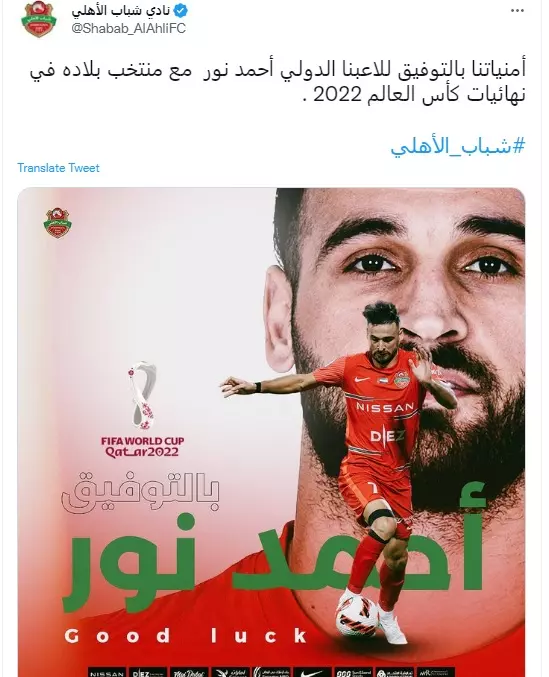 باشگاه شباب الاهلی امارات برای احمد نوراللهی ستاره ایرانی اش در جام جهانی آرزوی موفقیت کرد.