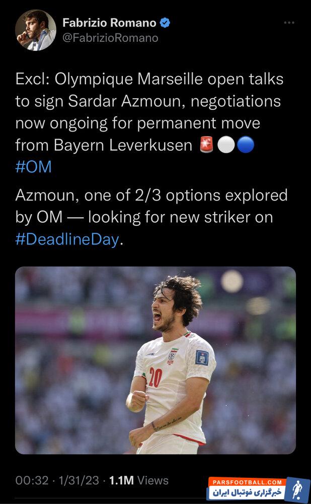 فابریتزیو رومانو، خبرنگار مطرح ایتالیایی با انتشار توئیتی اعلام کرد سردار آزمون، مهاجم ایرانی بایرلورکوزن آلمان در آستانه انتقال به المپیک مارسی فرانسه قرار دارد.