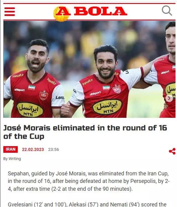 روزنامه آبولا پرتغال به حذف تیم فوتبال سپاهان از جام حذفی ایران واکنش نشان داد.