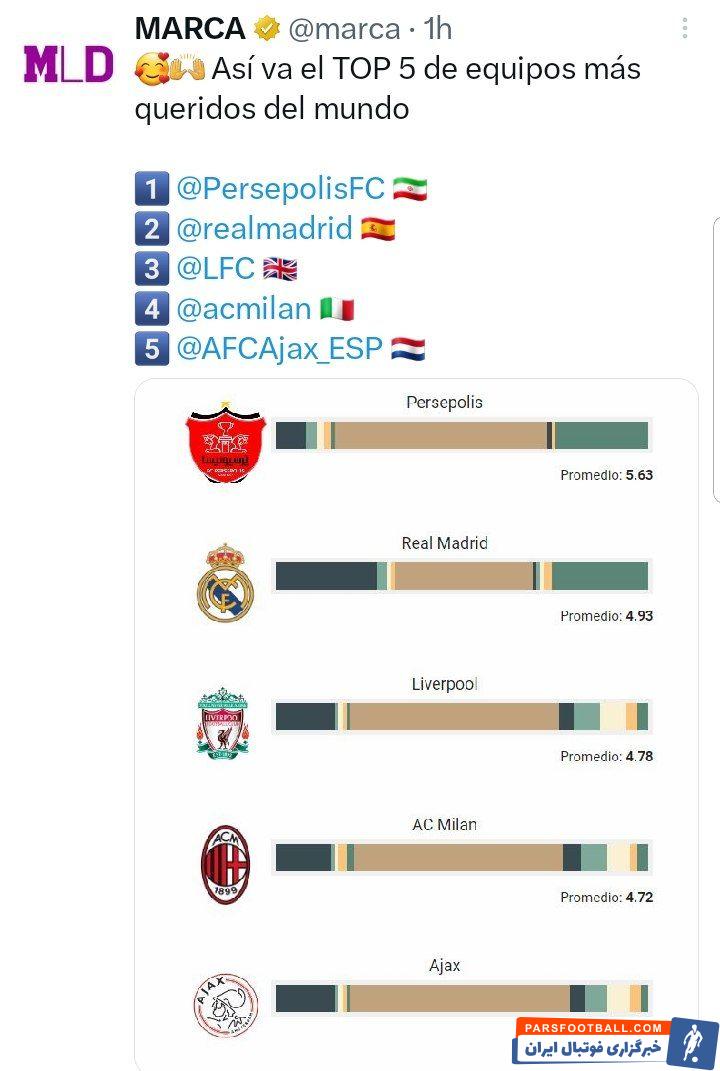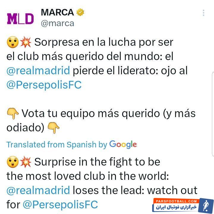 نکته جالب اینکه روزنامه مارکا، نشریه سمپات رئال مادرید محسوب میشود و در تمام نظرسنجیها نیز سفیدپوشان مادریدی صدرنشین بودهاند، اما حالا پرسپولیس شگفتی بزرگی را رقم زده است.