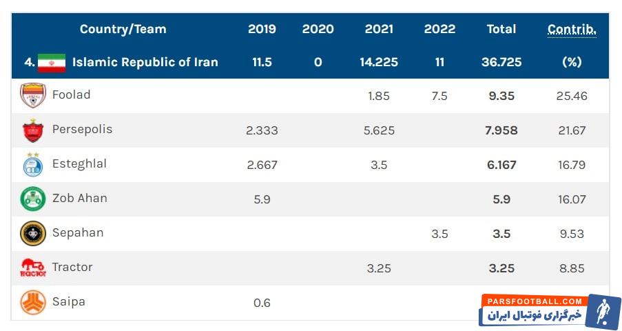 پس از فولاد، تیم های پرسپولیس با کسب ۷.۹۵۸ و همچنین استقلال با به دست آوردن ۶.۱۶۷ امتیاز در رتبه های بعدی قرار دارند. عملکرد ذوب آهن در سال ۲۰۱۹ بهتر از سپاهان بوده است و ذوبی ها در آن دوره ۵.۹ امتیاز را تصاحب کردند در حالیکه سپاهان امسال تنها ۳.۵ امتیاز جمع آوری کرد.