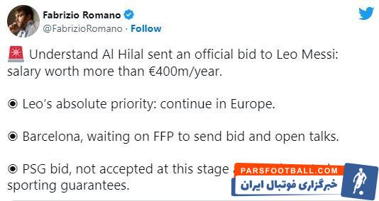 شامگاه سهشنبه، فابریتزیو رومانو، معروفترین خبرنگار فعال در حوزه نقل و انتقالات، با انتشار توییتی نوشت: الهلال پیشنهاد رسمی با دستمزد ۴۰۰ میلیون یورو در سال را به لیونل مسی ارائه داده است. اما اولویت اول لئو، حضور در فوتبال اروپاست. پیشنهاد پاریس نیز در این مرحله توسط کاپیتان تیم ملی آرژانتین رد شده، ضمن اینکه بارسلونا منتظر مسئله فیرپلی مالی است تا پیشنهاد خود را ارائه کند.