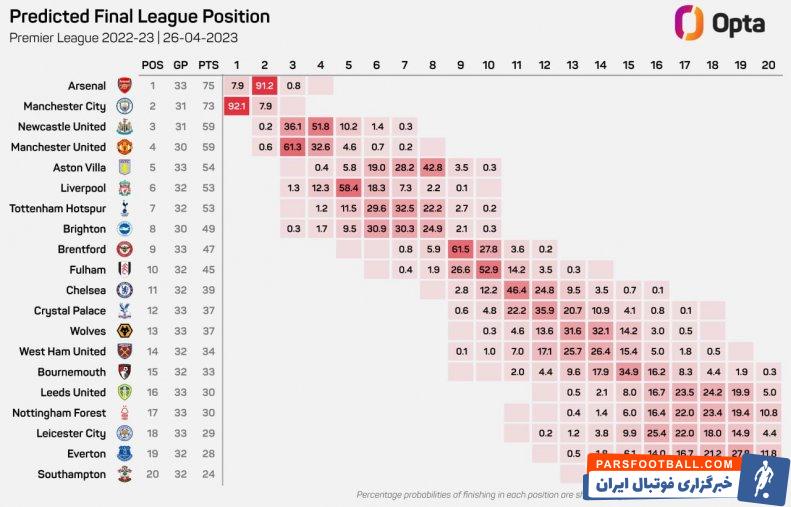 در واقع پپ گواردیولا برای بیستیمن بار در دوران حرفه‌ای خود به عنوان سرمربی آرسنال را شکست داده که این پنج بار بیشتر از هر تیم دیگری در دنیا محسوب می شود. با نتایج شب گذشته، حالا سایت اوپتا حدود ۹۲ درصد شانس قهرمانی این فصل لیگ برتر را به منچسترسیتی داده و اگر معجزه عجیب و غریبی رخ ندهد، به نظر می رسد باید یک بار دیگر تیم تحت هدایت پپ گواردیولا را قهرمان توصیف کرد.