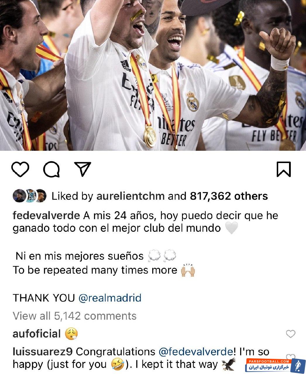 فتح کوپا دل ری با رئال مادرید توسط فده والورده، تبریک هموطنش را نیز به همراه داشت. رئال مادرید شنبه شب با پیروزی ۲-۱ مقابل اوساسونا برای ۲۰مین بار فاتح کوپا دل ری شد. فده والورده، هافبک اروگوئهای کهکشانیها در پستی در اینستاگرام خود، این پیروزی ارزشمند و کسب تمامی جامهای ممکن با رئال مادرید را جشن گرفت که با تبریک جالب لوییس سوارز، ستاره سابق بارسلونا و همبازیاش در تیم ملی اروگوئه مواجه شد.