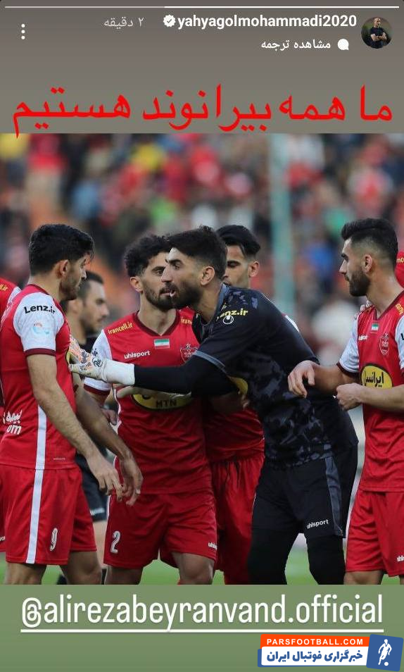 یحیی گل محمدی با انتشار تصویری از علیرضا بیرانوند در استوری خود از سنگربان شماره یک پرسپولیس حمایت کرد و نوشت : همه ما بیرانوند هستیم.