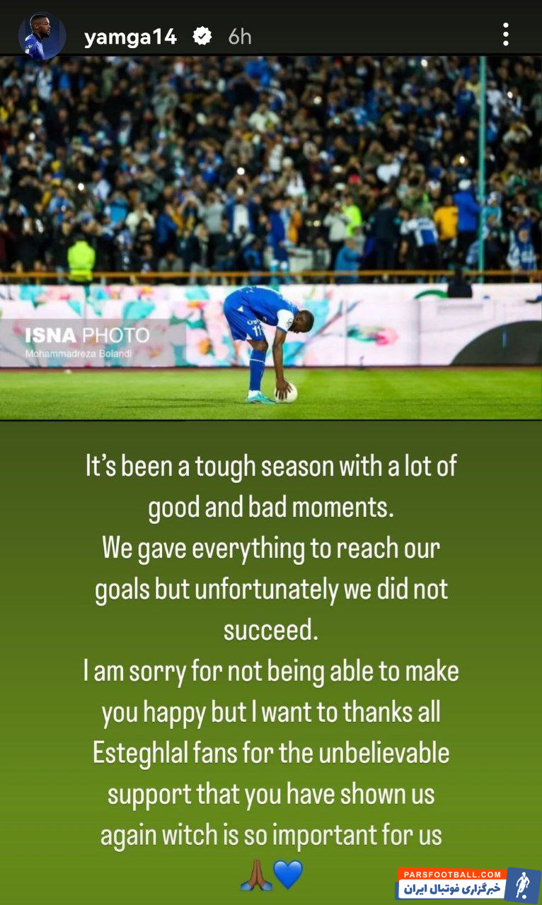 کوین یامگا ستاره فرانسوی استقلال با انتشار یک استوری از هواداران این تیم بابت ناکامی در کسب جام عذرخواهی کرد.