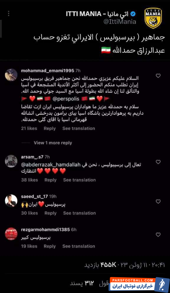 با وجود این مسئله، انتشار شایعه حضور حمدالله در پرسپولیس باعث شد تا کاربران زیادی به صفحه اینستاگرام ستاره مراکشی هجوم برده و خواستار حضور او در لباس سرخپوشان پایتخت شوند. مسئلهای که سریعا در عربستان بازتاب داشت و ویدیوها و تصاویر زیادی از کامنتهای هواداران پرسپولیس در فضای مجازی عربستان منتشر شد.
