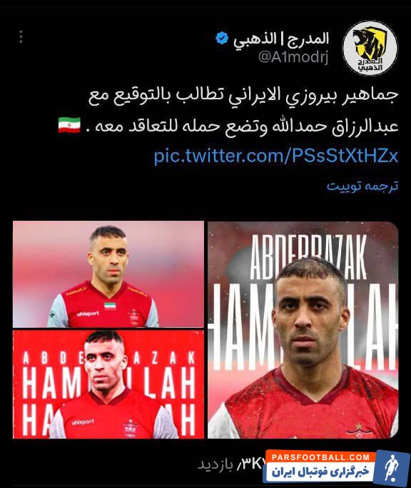 یکی از اخبار عجیبی که طی روزهای اخیر در فضای مجازی منتشر شده، بحث علاقه باشگاه پرسپولیس به عبدالرزاق حمدالله، مهاجم مطرح و نامدار مراکشی است که در سالهای گذشته نیز شایعاتی درباره حضور او در تیمهای ایرانی مطرح شده بود. با پیوستن کریم بنزما فوق ستاره فرانسوی رئال مادرید به الاتحاد و اعطای شماره ۹ به این بازیکن که پیش از این بر تن حمدالله بود، شایعات در مورد جدایی این بازیکن به گوش میرسید. ستارهای که با کسب عنوان آقای گلی عربستان، سهم بزرگی در قهرمانی تیمش در لیگ حرفهای این کشور آن هم پس از ۱۴ سال داشت.