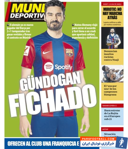 روزنامه موندودیپورتیوو از جذب ایلکای گوندوگان اطمینان دارد و با انتشار عکس این بازیکن با پیراهن بارسلونا تیتر “گوندوگان خریده شد” را انتخاب کرده است.