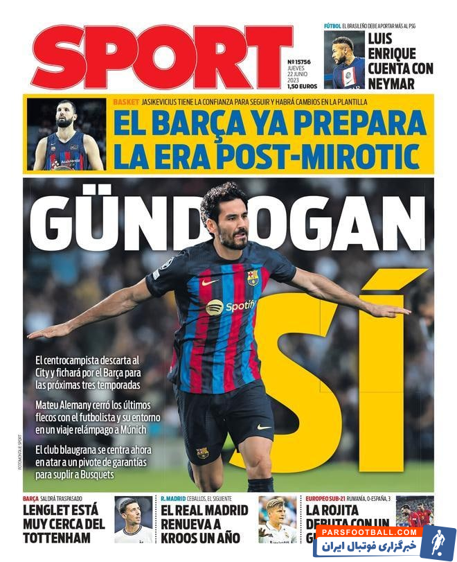 “گوندوگان: بله” تیتر امروز روزنامه اسپورت است. در توضیح این تیتر روزنامه اسپانیایی یادآورد شد: “هافبک پیشنهاد سیتی را رد کرد و برای سه فصل آینده با بارسا امضا خواهد کرد. متئو آلمانی آخرین جزئیات را با این فوتبالیست و اطرافیانش در سفر برق آسا به مونیخ بست.”