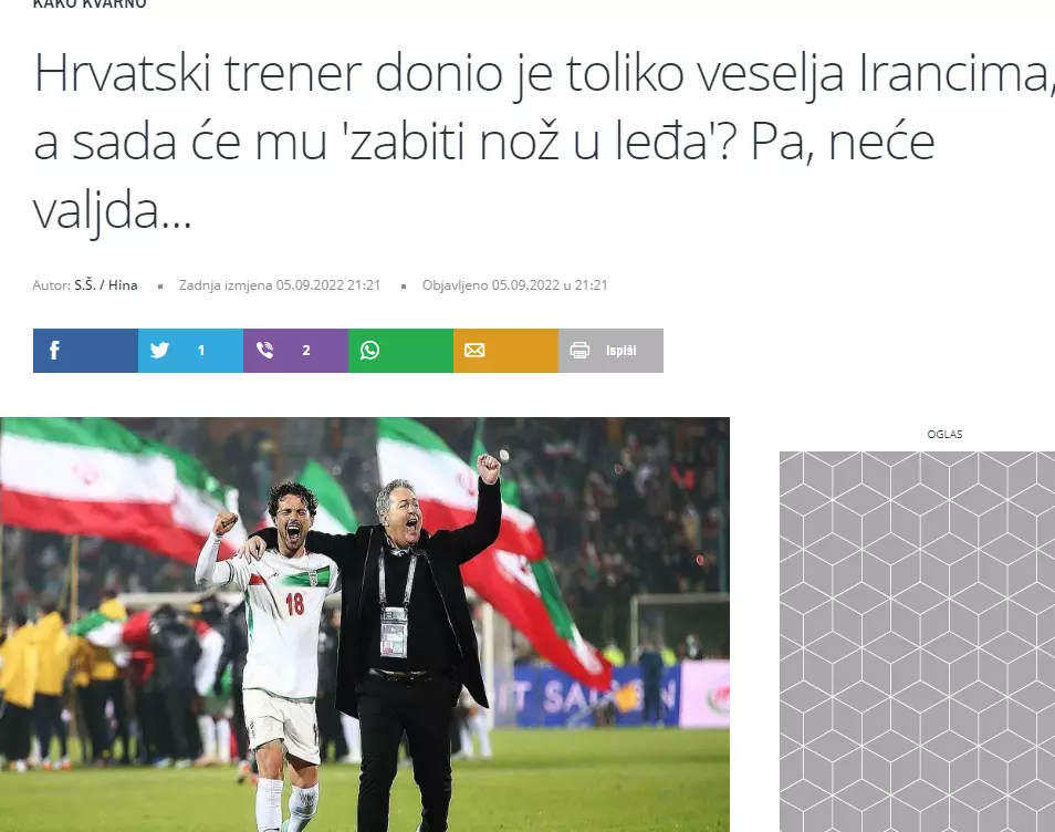 سایت tportal کرواسی در گزارش خود از تیتر «سرمربی کروات این همه خوشحالی برای ایرانیها به ارمغان آورد و حالا میخواهند از پشت خنجر بزنند؟» استفاده کرد و نوشت:
