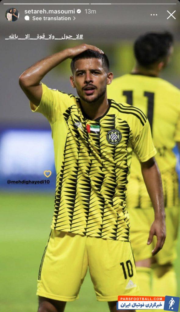 قایدی که فصل گذشته عملکرد فوقالعادهای در استقلال داشت نشان داد این فصل هم آمادگی بالایی دارد. پس از گلزنی قایدی در بازی امروز همسرش یک استوری برای او منتشر کرد و عبارت «لا حول و لا قوه الا بالله» را در آن نوشت.