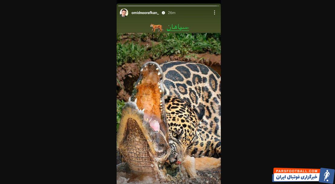 در استوری امید نورافکن که تصویر آن را مشاهده می کنید، یک پلنگ در حال شکار تمساح است. امید نورافکن همچنین هشتگ سپاهان را در کنار اموجی پلنگ در این استوری آورده است.