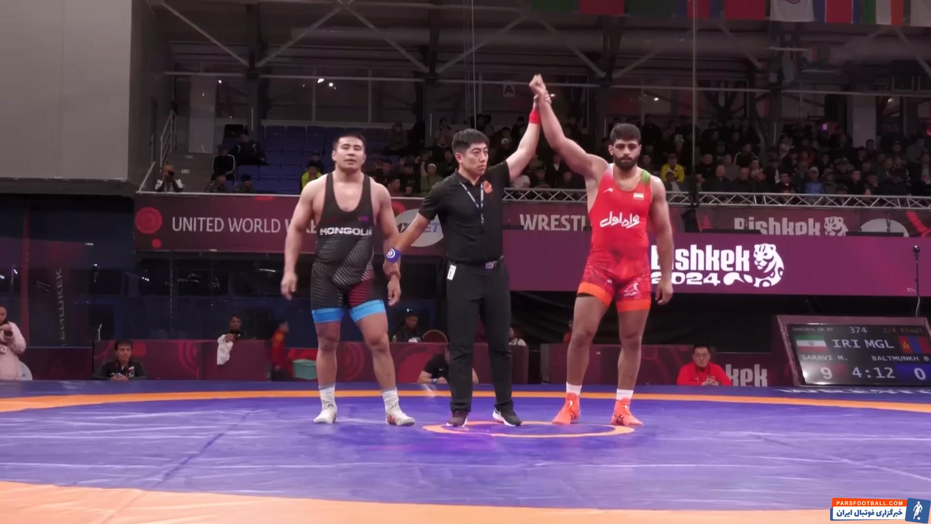 در وزن ۹۷ کیلوگرم که ۱۰ کشتی گیر حضور دارند، محمدهادی ساروی پس از استراحت در دور نخست، در دور دوم به مصاف بالتمونخ از مغولستان رفت و با برتری ۹ بر صفر به نیمه‌نهایی صعود کرد.