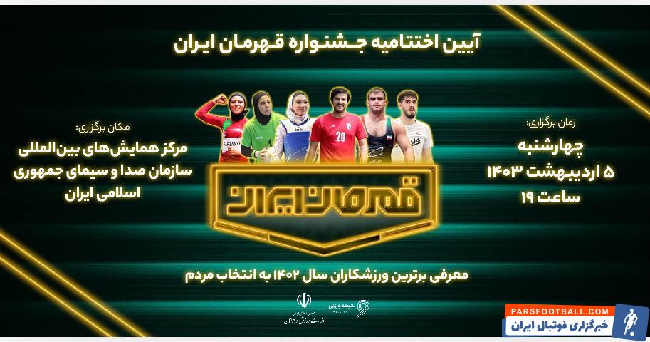 پس از مشارکت چشم گیر مخاطبان شبکه ورزش سیما در رای گیری قهرمان ایران که به انتخاب برترین ورزشکاران سال ۱۴۰۲ پرداخت، قرار است پنجم اردیبهشت ماه با پخش زنده تلویزیونی همزمان شبکه ورزش و شبکه سه برترین ورزشکاران سال ۱۴۰۲ در اختتامیه جشنواره قهرمان ایران معرفی شوند.