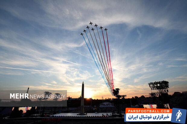 پرواز چند  فروند هواپیما بر فراز آسمان و به نمایش در آمدن تصویری از سه رنگ پرچم کشور فرانسه از بخش های دیدنی ابتدایی مراسم افتتاحیه بود.