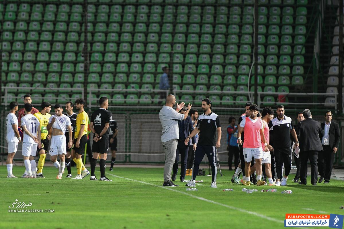 سرمربی ملوان در این لحظه به داور مسابقه و مسئولین برگزاری مسابقه به وضوح اعلام میکند که «ادامه مسابقه به چه قیمتی» و در ادامه صحبت او سید جلال رافخایی کمک مربی ملوان با اشاره دست به بازیکنان اعلام میکند که به کنار زمین بیایند و از ادامه بازی خودداری کنند.