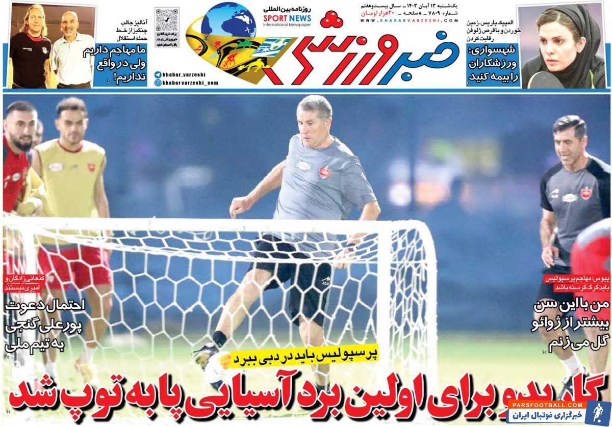 به گزارش خبرورزشی، روزنامه خبرورزشی هنوز جایگاه خود روی کیوسک و در دل هواداران ورزش حفظ کرده است. یکشنبه ۱۳ آبان ۱۴۰۳ در شماره ۷۸۰۹ این روزنامه می‌توانید این مطالب را بخوانید؛ گاریدو راه بردن الغرافه را پیدا کرد!