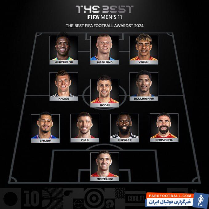 نام کیلیان امباپه در این لیست به چشم نمی خورد. در این تیم منتخب، مارتینس آرژانتینی جایزه دروازه بان سال را برده، وینیسیوس، رودری و بلینگام در مراسم د بست، اول تا سوم شده اند، دنی کارواخال و یامال صاحب رتبه های چهارم و پنجم هستند و حضور این ۵ نفر در تیم منتخب کاملا منطقی بود اما لیونل مسی که ششم شد، در تیم منتخب جایی ندارد. نفر هفتم و هشتم یعنی تونی کروس و ارلینگ هالند به تیم منتخب راه یافته اند اما خبری از نفر نهم که ستاره فرانسوی کیلیان امباپه باشد، نیست.