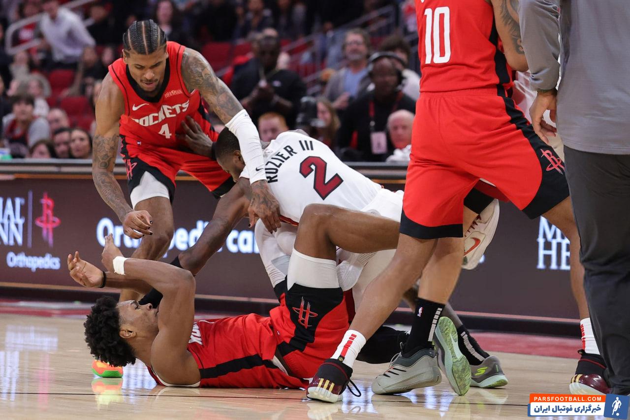 تایلر هیرو و امن تامپسن، عجب دعوایی! هیرو در جریان پیروزی هیت مقابل راکتس، از تامپسن یک فن ۴ امتیازی خورد که منجر به رقم خوردن جنجالیترین صحنه امروز شد. هیرو پاسخ تامپسن را نداد اما تری روزیر همانطور که در تصویر تیتر مشخص است، به جان بازیکن سال دومی راکتس افتاد. هیرو که همراه با روزیر پس از این دعوا اخراج شد، آمار ۲۷/۶/۹ ثبت کرد. از هیوستون هم امن تامپسن، جیلن گرین، ایمه اودوکا و دستیارش اخراج شدند!
