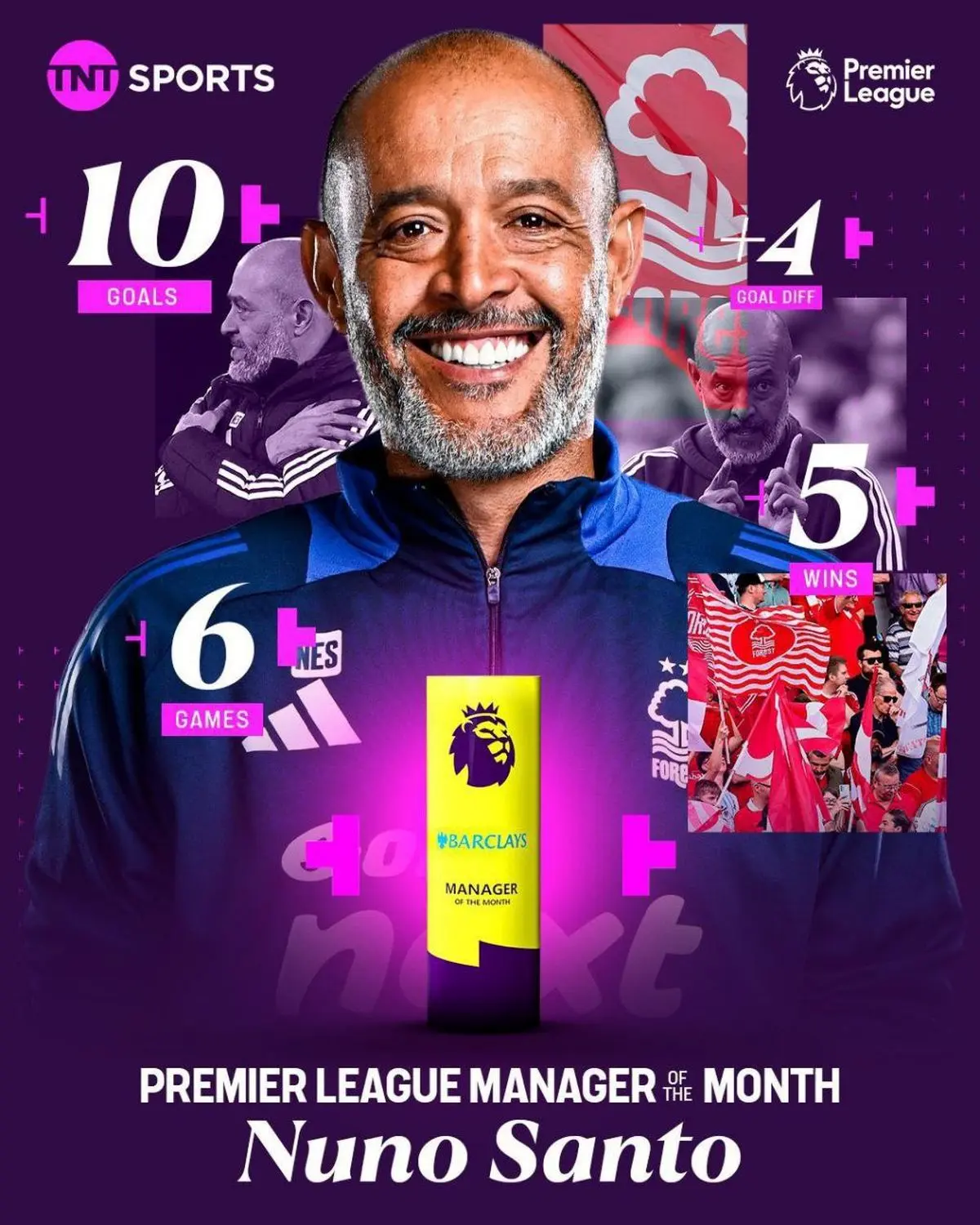 نونو برای اولین بار از سال ۱۹۹۴، فارست را با پنج پیروزی از شش بازی ماه دسامبر، از جمله سه کلینشیت متوالی، به مقام دوم جدول لیگ برتر رساند. این مربی تا امروز با ولورهمپتون در سپتامبر ۲۰۱۸، ژوئن ۲۰۲۰ و اکتبر ۲۰۲۰، با تاتنهام در آگوست ۲۰۲۱، و اکنون فارست در اکتبر و دسامبر ۲۰۲۴ این جایزه را کسب کرده است.