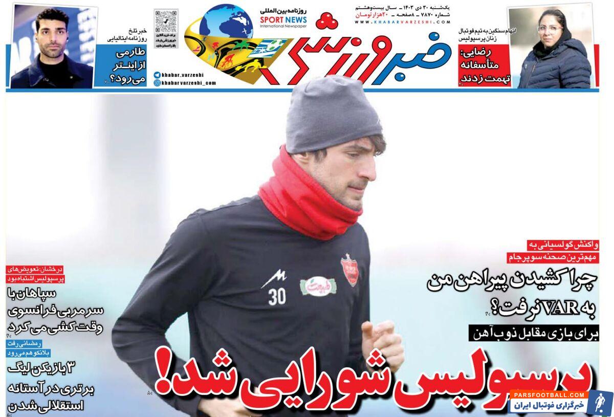 به گزارش خبرورزشی، پرسپولیس شورایی شد عنوان تیتر اول روزنامه خبرورزشی است. همچنین در شماره امروز خبرورزشی به صجنه مشکوک دقایق پایانی سوپرجام اشاره شده است.