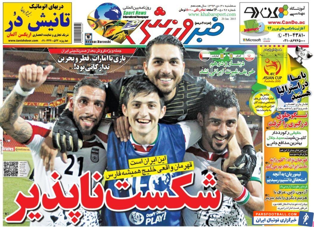به گزارش خبرورزشی، تیم ملی فوتبال کشورمان در ۲۹ دی سال ۱۳۹۳ سومین مسابقه مرحله گروهی جام ملتهای ۲۰۱۵ را نیز با پیروزی پشت سر گذاشت و امارات را یک بر صفر شکست داد تا مقتدرانه و با کسب ۹ امتیاز راهی یکچهارم نهایی شود. ما در مرحله گروهی آن مسابقات موفق به شکست بحرین، قطر و امارات، سه همسایه خود در خلیج فارس شدیم تا خبرورزشی در ۳۰ دی سال ۹۳ پس از پایان مرحله گروهی با تیتر “شکست ناپذیر” به استقبال این اتفاق خوشایند برود.