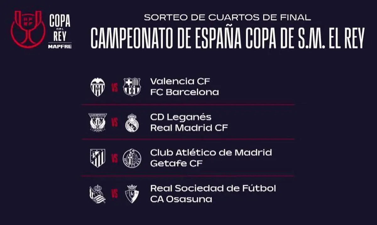 رئال، بارسلونا، اتلتیکو، ختافه، لگانس، والنسیا، رئال سوسیداد و اوساسونا تیمهای حاضر در مرحله یک چهارم نهایی کوپا دل ری هستند. و این مرحله نیز به صورت تک بازی و در بین ۱۶ تا ۱۸ بهمن انجام خواهد شد.