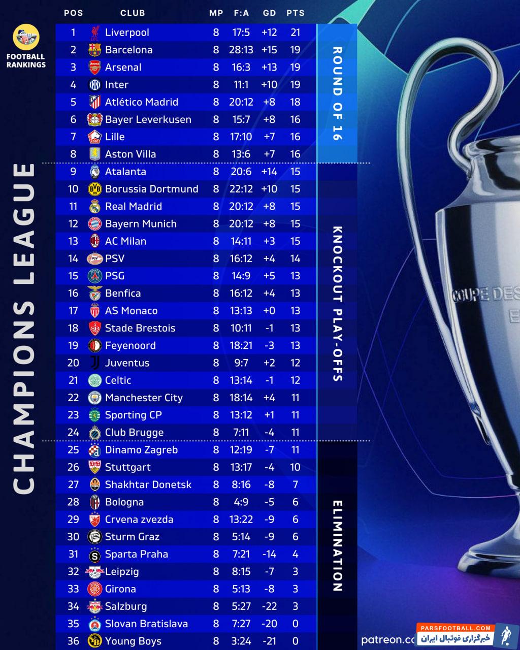 جدول لیگ قهرمانان اروپا ۲۵-۲۰۲۴ در پایان هفته هشتم و مسیر لیگ