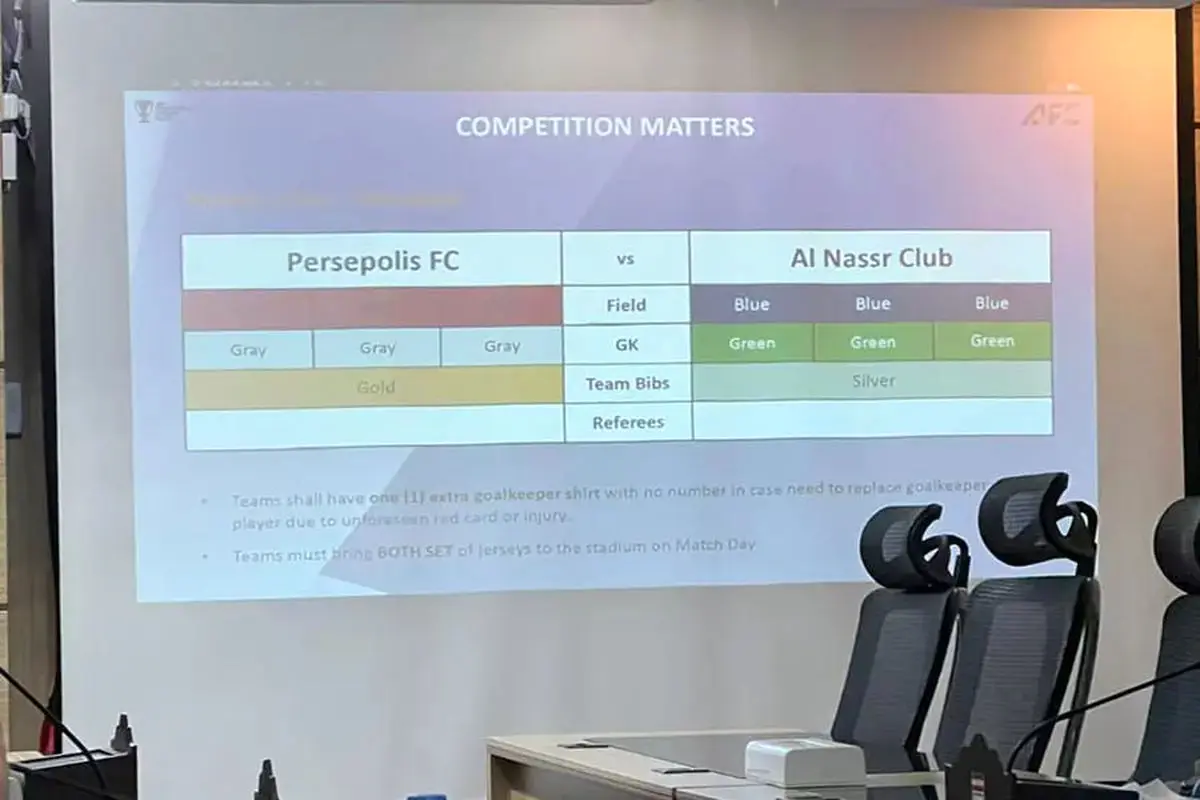 در این جلسه اعلام شد؛ النصر با رنگ دوم خود در بازی حضور خواهد داشت و به این ترتیب لباس آبی به تن خواهند کرد و دروازهبان آنها نیز سبز به تن میکند.
