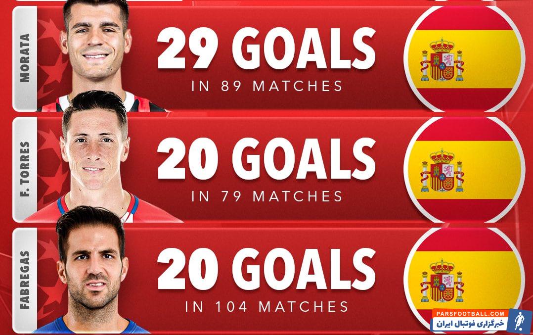 | ۳ | آلوارو موراتا | ۲۹ | ۸۹ | رئال مادرید، اتلتیکو مادرید، چلسی، یوونتوس و میلان |