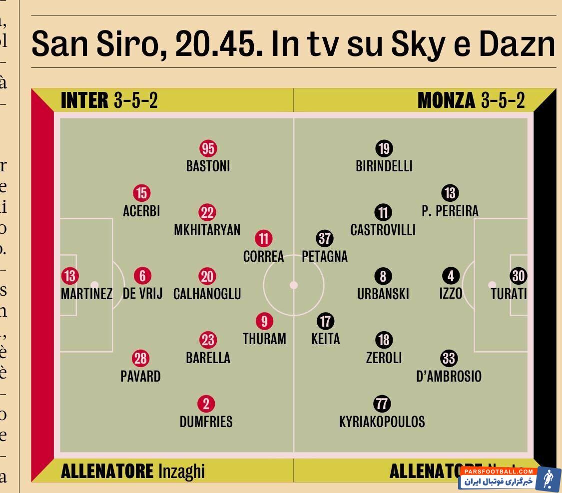 به گزارش خبرورزشیف در حالی که روزنامه معتبر گاتزتا دلو اسپرت پیش بینی کرده بود زوج تورام و کوره آ مقابل مونزا بازی کنند، اینزاگی هر دو مهاجم مدنظر این روزنامه را روی نیمکت نشاند و زوج لائوتارو و آرناتوویچ را به میدان فرستاد.