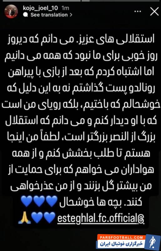 “استقلالیهای عزیز میدانم که دیروز روز خوبی برای ما نبود که همه میدانیم، اما اشتباه کردم که بعد از بازی با پیراهن رونالدو پست گذاشتم. نه به این دلیل که خوشحالم که باختیم، بلکه رویای من است که با او دیدار کنم و میدانم که استقلال بزرگ از النصر بزرگتر است. لطفاً من اینجا هستم تا طلب بخشش کنم و از همه هواداران میخواهم که برای حمایت از من بیشتر گل بزنند و از من عذرخواهی کنند. بچهها خوشحال.”