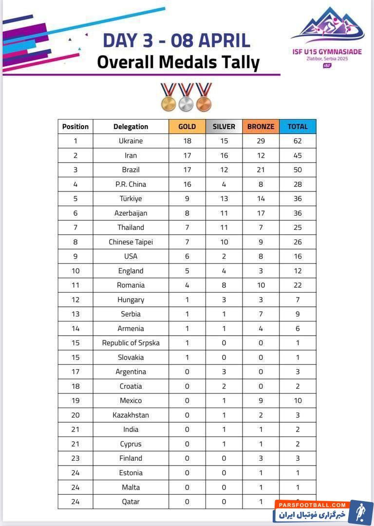 کاروان ایران با احتساب مدالهای کسب شده، در پایان روز سوم با کسب ۱۷ طلا، ۱۶ نقره و ۱۲ برنز پس از اوکراین که ۱۸ طلا، ۱۵ نقره و ۲۹ برنز گرفته در جایگاه دوم جدول ردهبندی توزیع مدالها قرار گرفته است.