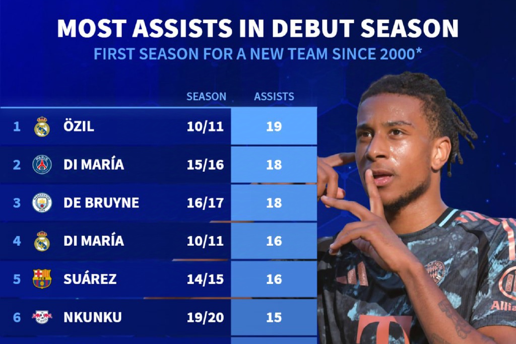 در حال حاضر، مایکل اولیسه در جایگاه دوازدهم این فهرست قرار گرفته است. او در ۴۳ بازیای که تا اینجای فصل برای بایرن مونیخ در تمام رقابتها انجام داده، آمار ۱۳ گل و ۱۳ پاس گل را بهثبت رسانده است. وینگر فرانسوی سابق کریستال پالاس تا پایان فصل بین ۷ تا ۱۰ بازی (بسته به پیشروی بایرن مونیخ در لیگ قهرمانان اروپا) برای بهبود آمار خوب خودش فرصت دارد.