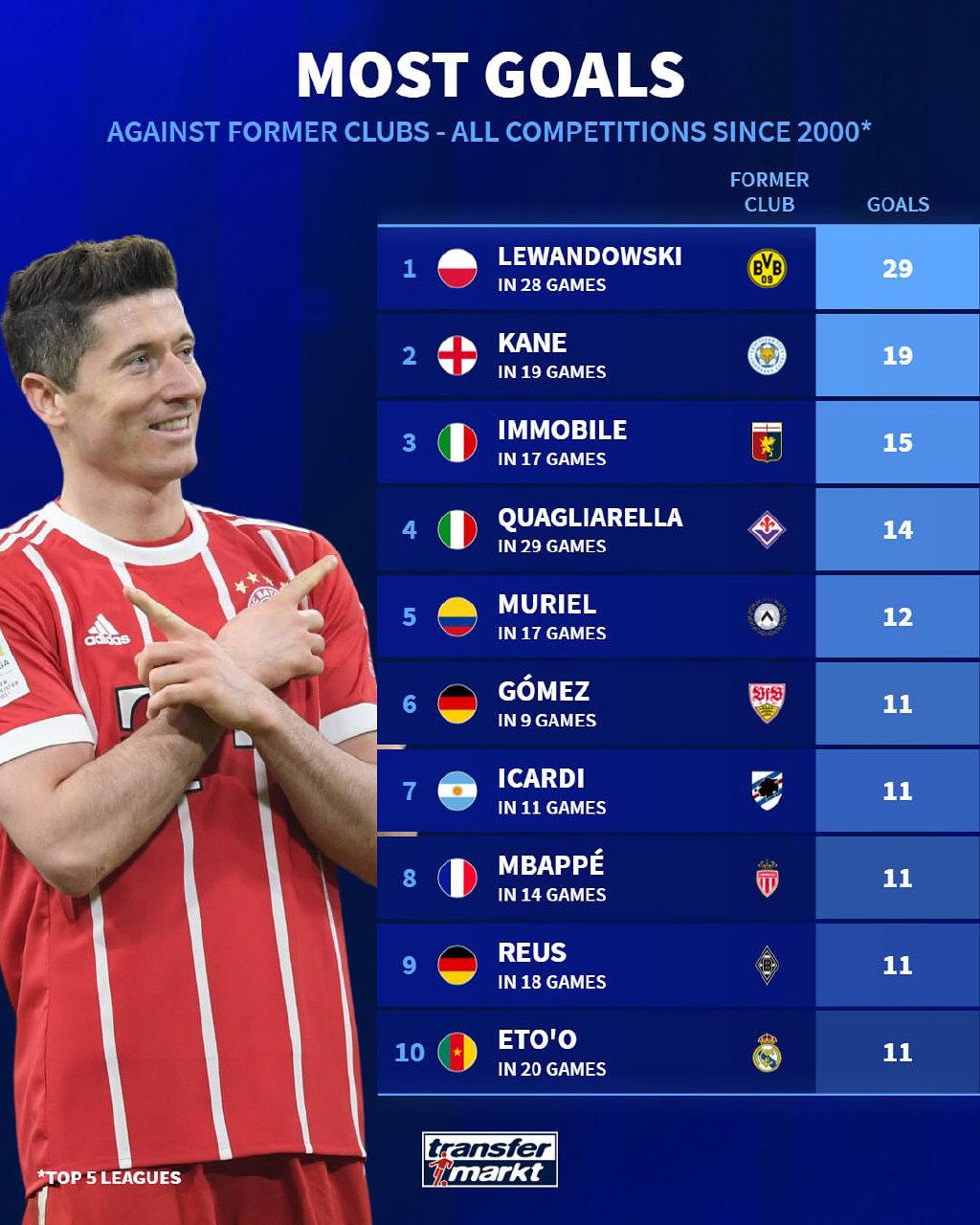 به گزارش خبرگزاری خبرآنلاین؛ روبرت لواندوفسکی و هری کین بیشترین گل‌ها را در پنج لیگ معتبر اروپایی مقابل تیم‌های سابقشان زده‌اند. لواندوفسکی پس از انتقال به بایرن مونیخ، در ۲۸ بازی مقابل دورتموند ۲۸ گل زد و ۲۱ پیروزی به‌دست آورد. هری کین نیز در ۱۹ بازی مقابل لسترسیتی، که به‌طور قرضی در آن بازی کرده بود، ۱۹ گل زد. همچنین، بازیکنانی مانند مائورو ایکاردی، کیلیان امباپه، مارکو رویس و ساموئل اتوئو هم عملکرد خوبی برابر تیم‌های سابقشان داشته‌اند.