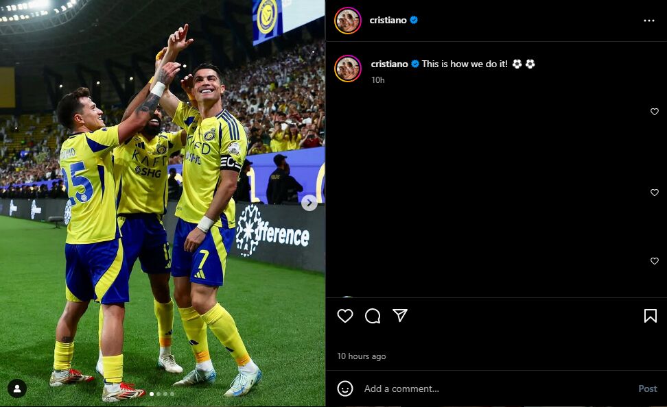 کریستیانو رونالدو که در ۴۰ سالگی همچنان آماده نشان میدهد به دو گلی که برابر الریاض به ثمر رساند واکنش نشان داد.