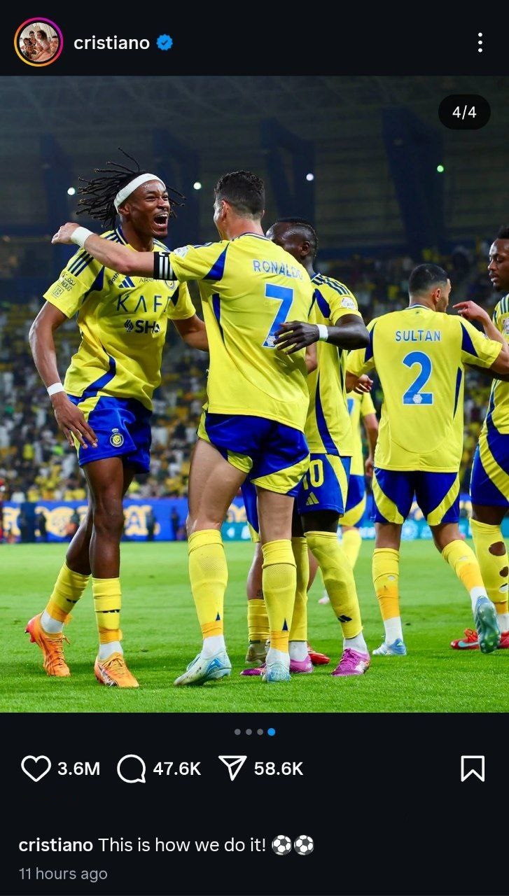 کریستیانو رونالدو در شبکه اجتماعی اینستاگرام نسبت به پیروزی باشکوه شب گذشته مقابل الریاض واکنش نشان داد و نوشت: