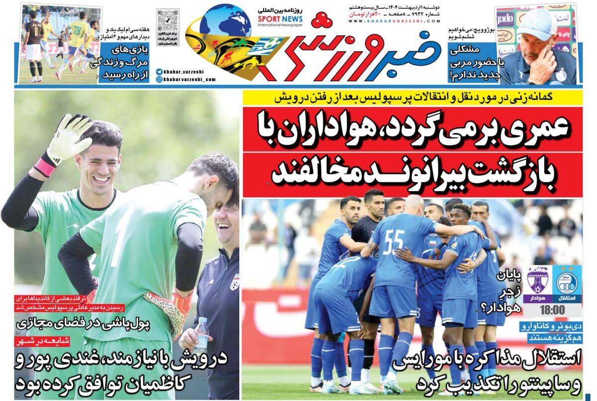 تیتر یک خبرورزشی فردا اما بازگشت محمد عمری به پرسپولیس و مخالبفت هواداران با برگشتن بیرانوند است.