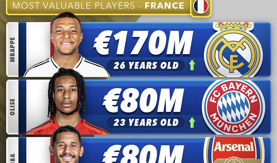 مایکل اولیسه که فصل بسیار خوبی را در بایرن مونیخ سپری می‌کند، حالا در کنار دو بازیکن دیگر با ارزشی ۸۰ میلیون یورویی قرار گرفته است. ویلیام سالیبا، مدافع میانی آرسنال و اورلین شوامنی، هافبک رئال مادرید هم ۸۰ میلیون یورو ارزش دارند.